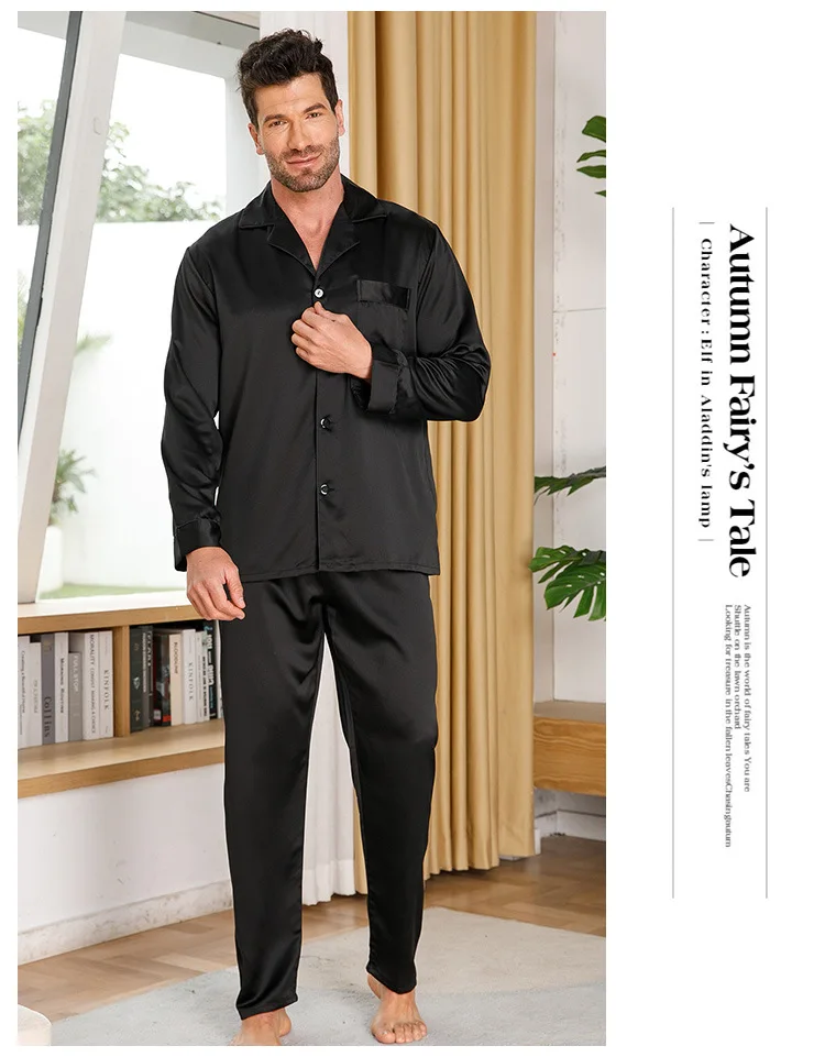 Black Pajamas Suit Men Satin Home Clothes Long Sleeve Shirt&pants 2Pcs Nightwear Casual Outfit Solid Sleepwear Man Loungewear
