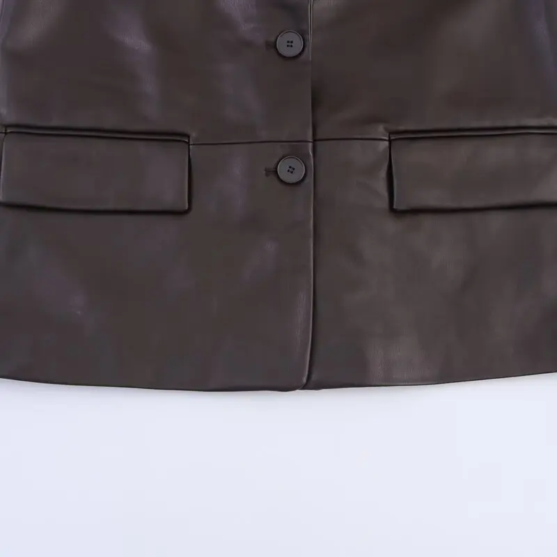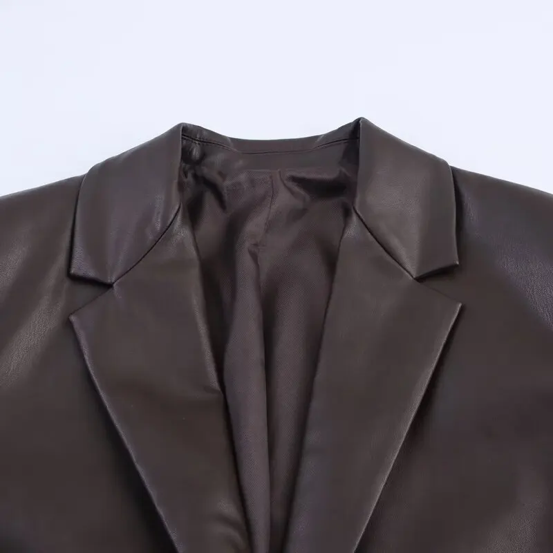 Crafted from PU leather, this blazer provides a sleek, sophisticated look without the bulk of traditional leather.