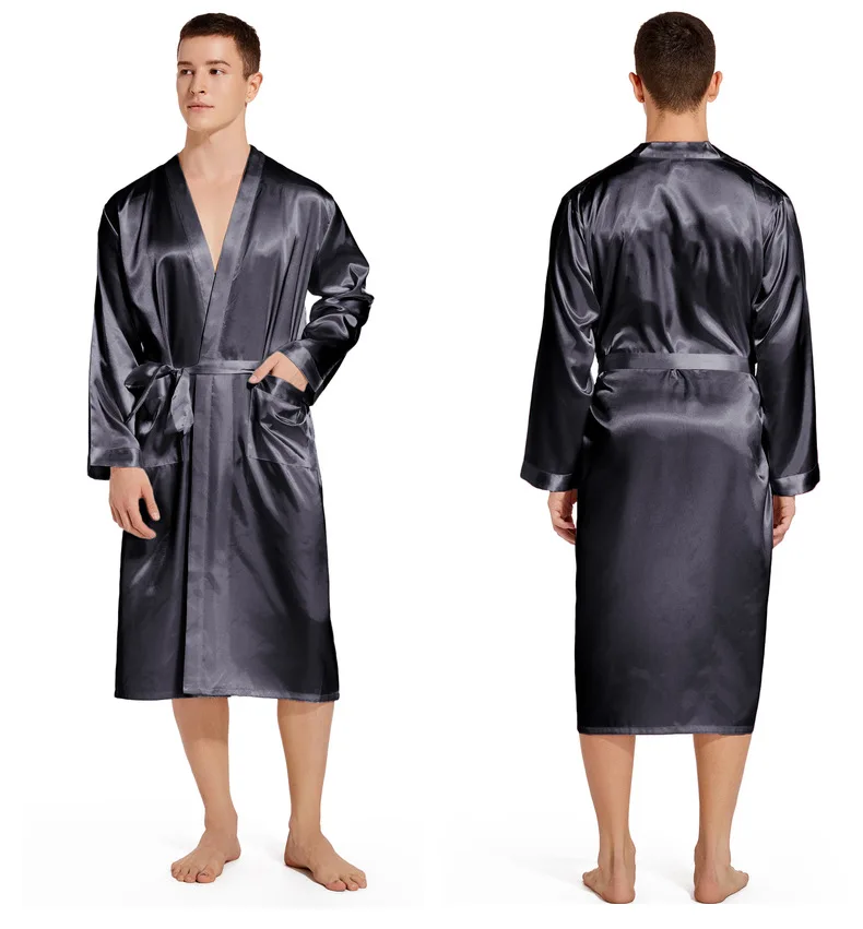 Men Long Bathrobe Sleepwear Navy Blue Silk Satin Bridegroom Wedding Robe Kimono Gown Spring Summer Home Clothes Loungewear