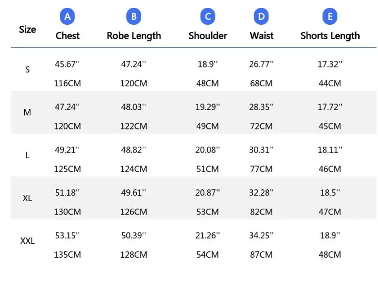 Size XL: Chest 130 cm (51.18''), Robe Length 126 cm (49.61''), Shoulder 53 cm (20.87''), Waist 82 cm (32.28''), Shorts Length 47 cm (18.5'')